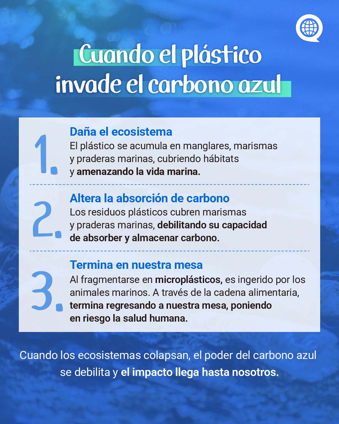 El uso de plásticos en la vida cotidiana de los estudiantes puede llegar a los océanos y ecosistemas de carbono azul a través de ríos y costas.